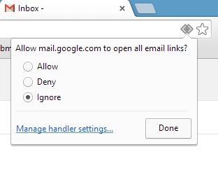 برای تعیین اکانت جیمیل خود در کروم، تنها وارد آن شده و بر روی علامتی که در تصویر زیر مشخص شده کلیک نمایید. سپس با انتخاب گزینهی Allow اکانت جیمیل خود را به سرویس ایمیل پیشفرض مرورگر کروم تبدیل کنید.