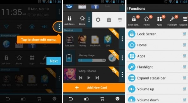 هر کدام از این موارد یک کارت (Card) نام دارند و امکان افزودن و یا حذف آنها به راحتی فراهم خواهد بود. با اینکه اکثر این کارتها بر روی دستگاههای روت نشده کار میکنند اما برخی از آنها نظیر میانبرهای عملی هوماسکرین نیاز به روت دارند.